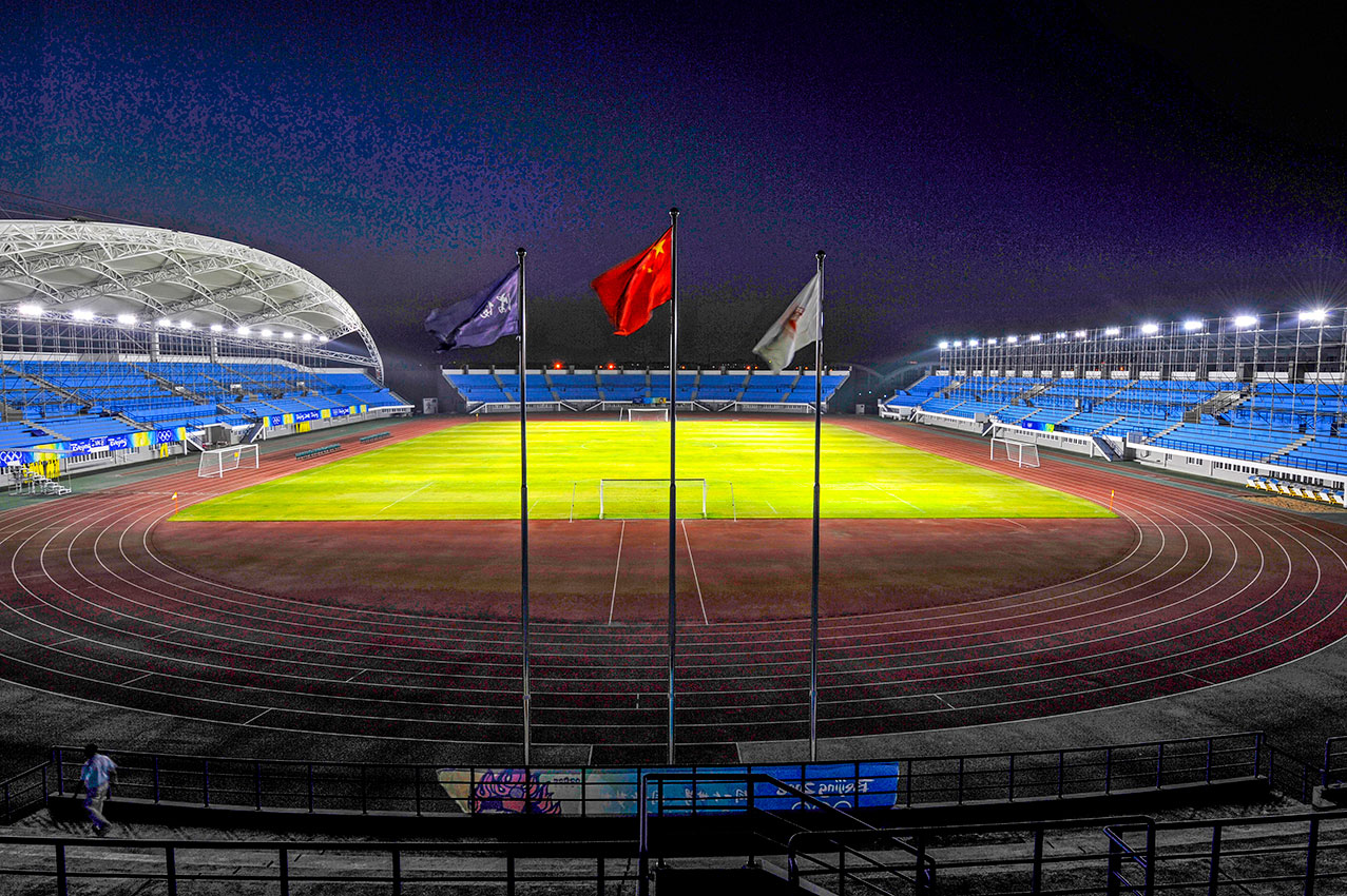 夜幕下的田径场飘扬着五星红旗